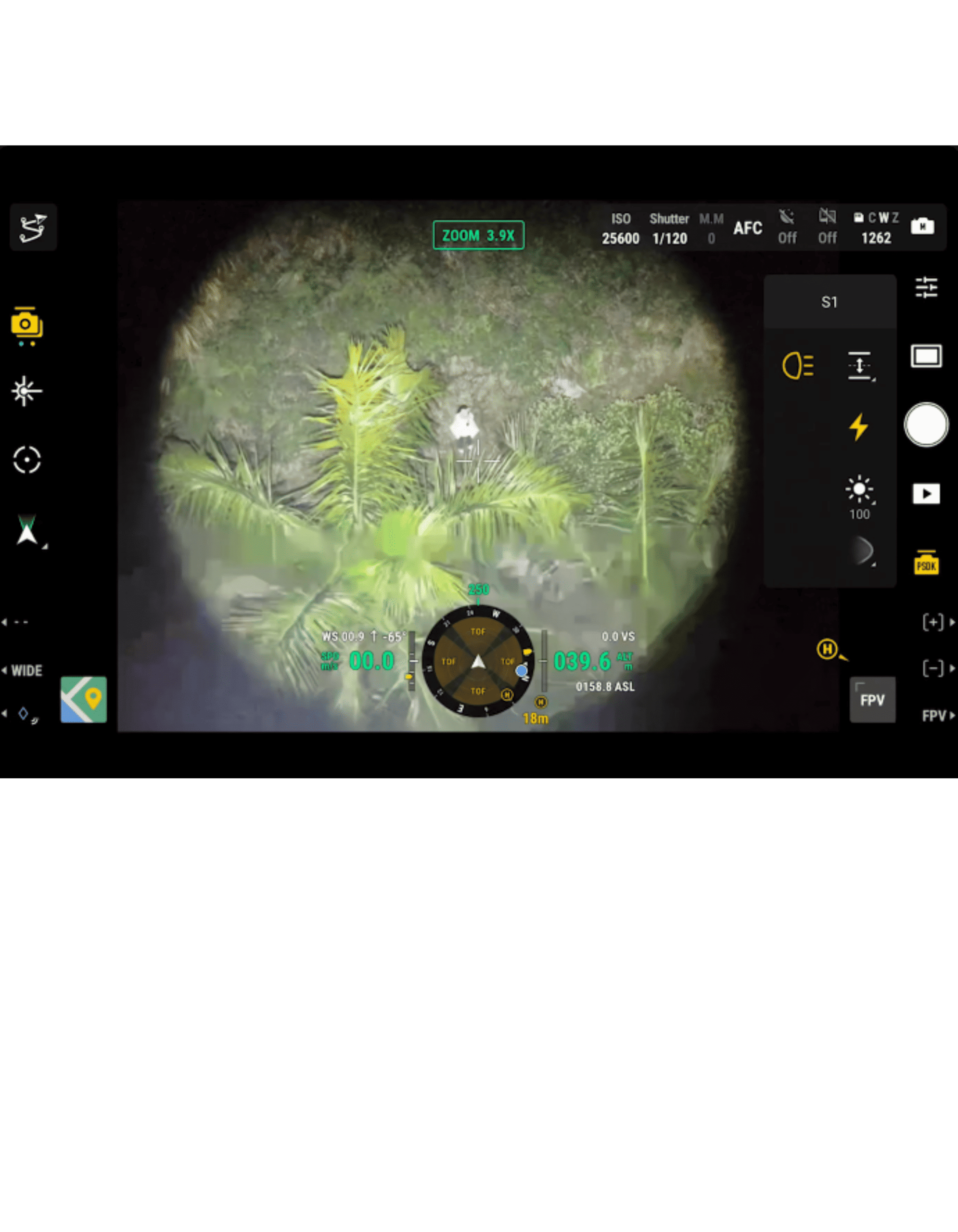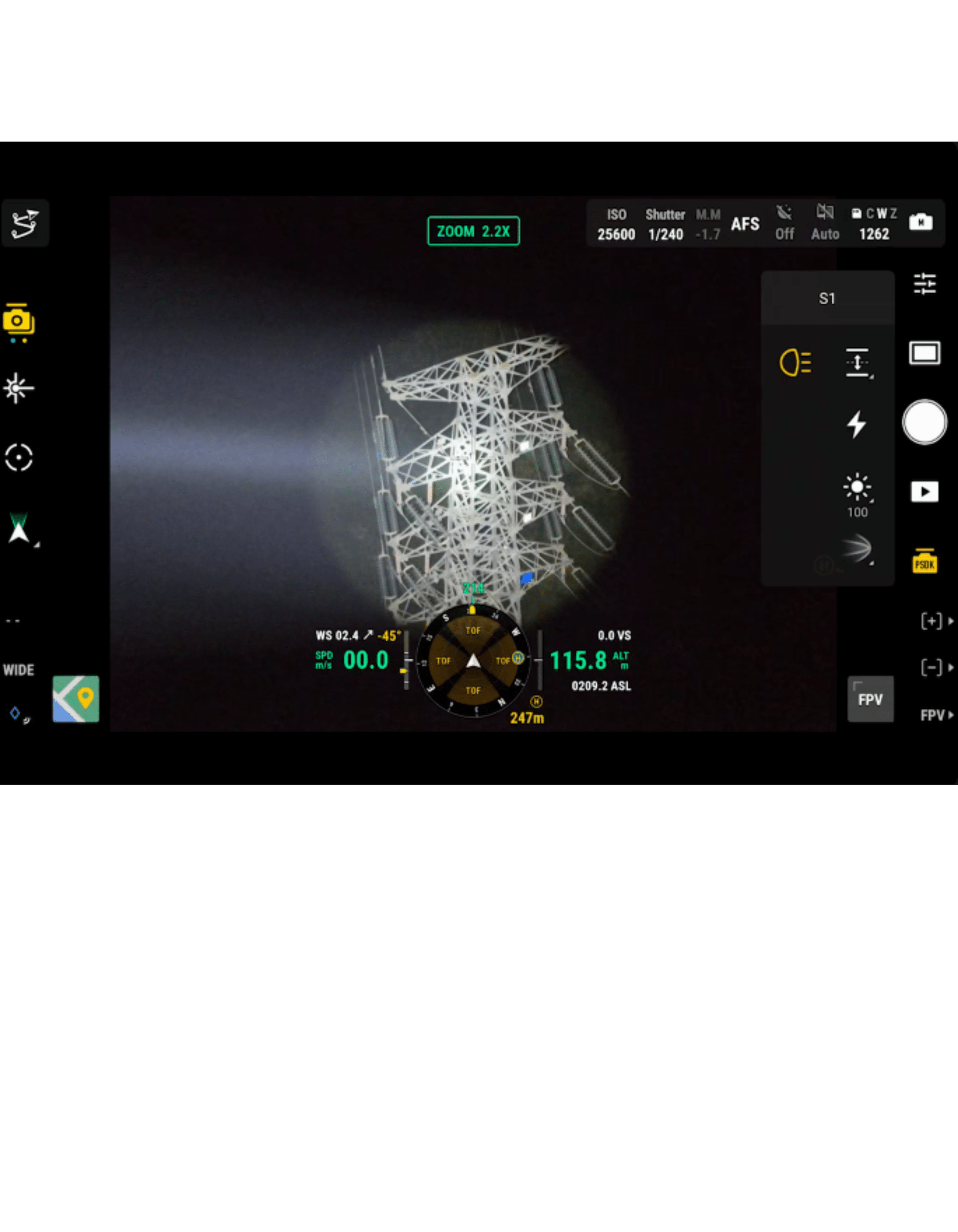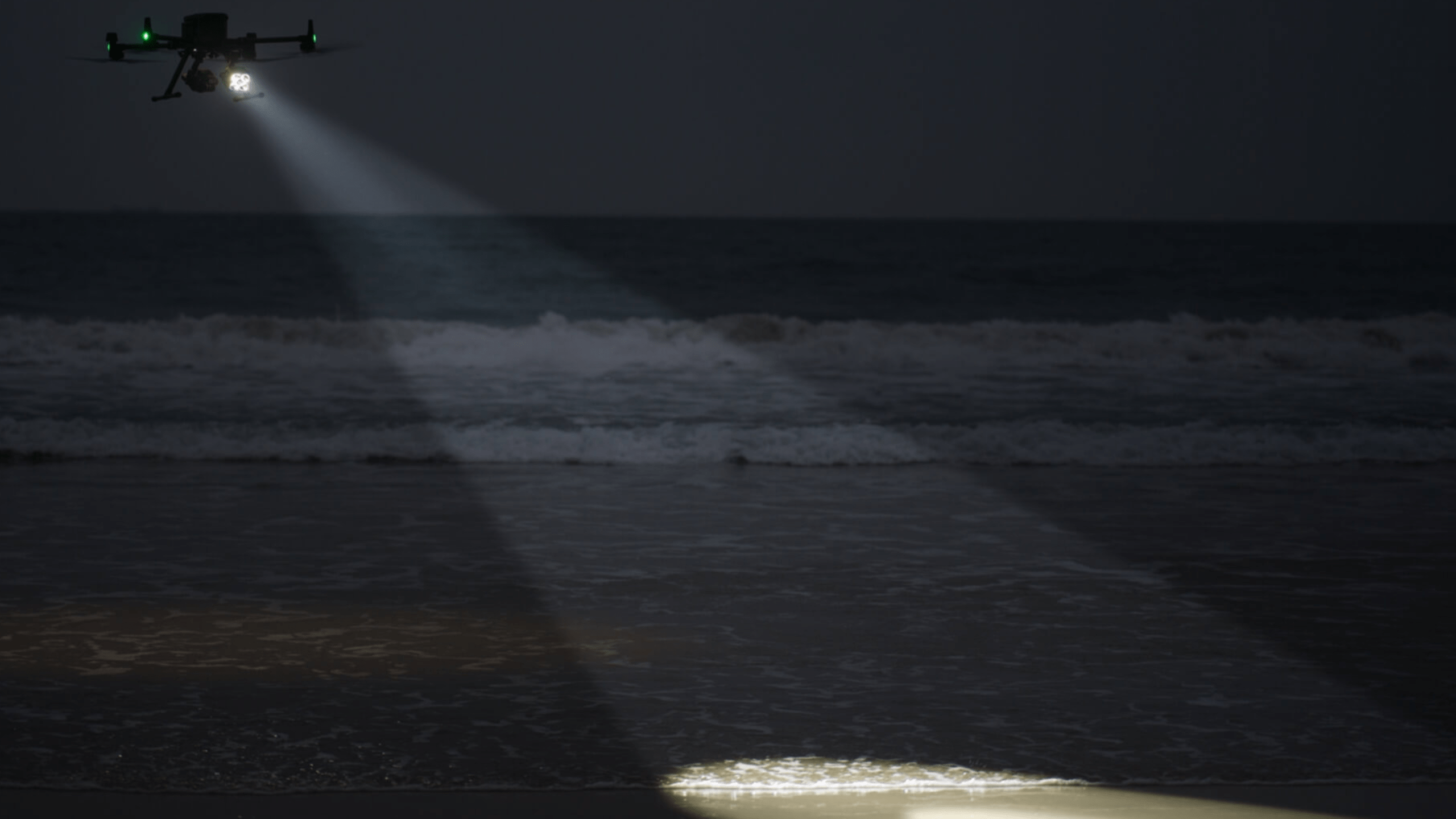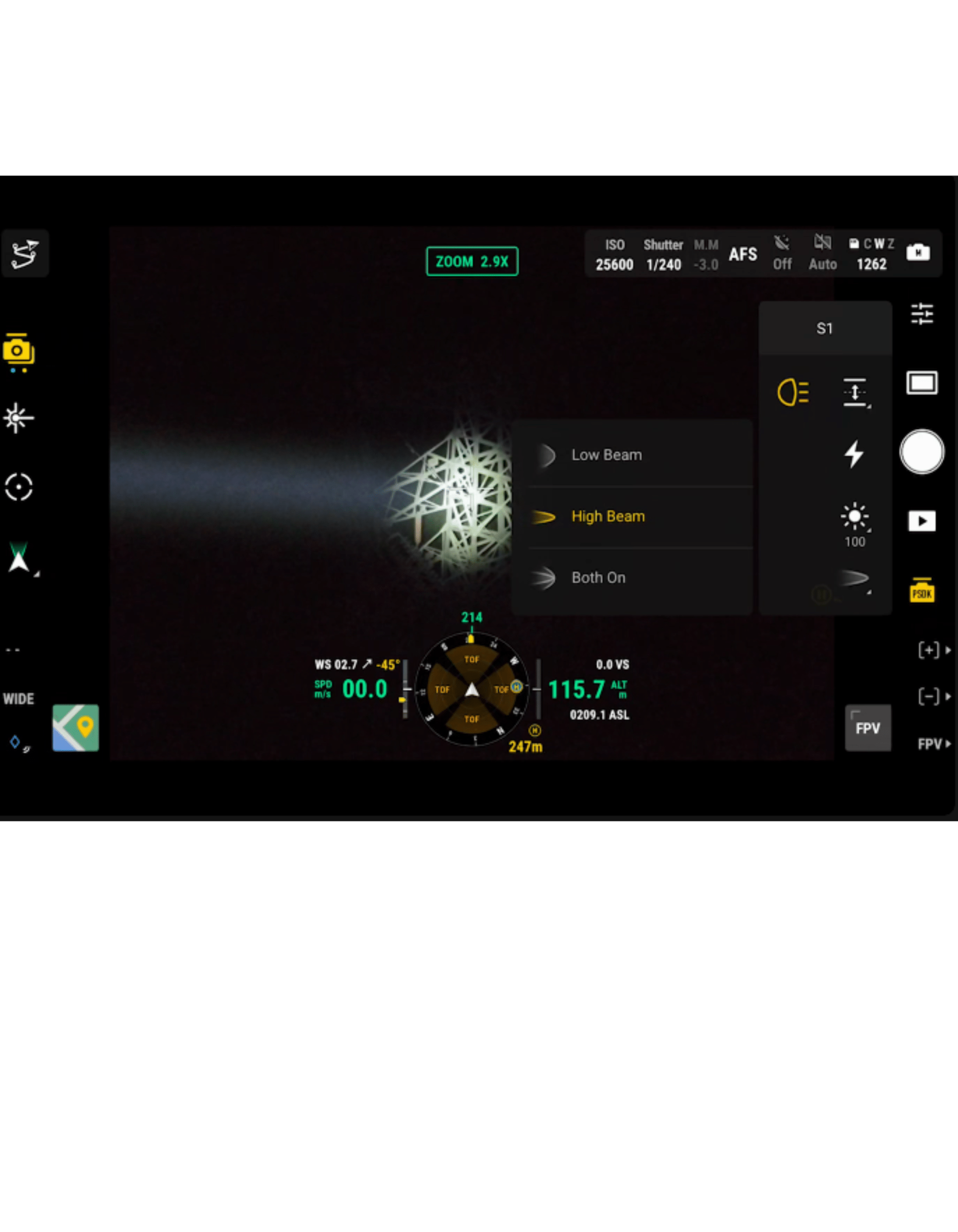 Zenmuse S1 delivers a maximum central illuminance of 35 lux at 100 meters, providing ample lighting in dark environments to clearly distinguish details of the subjects. Additionally, the power consumption in the High Beam mode is only 17 W, reducing the power load on the drone and helping to maintain the flight time.